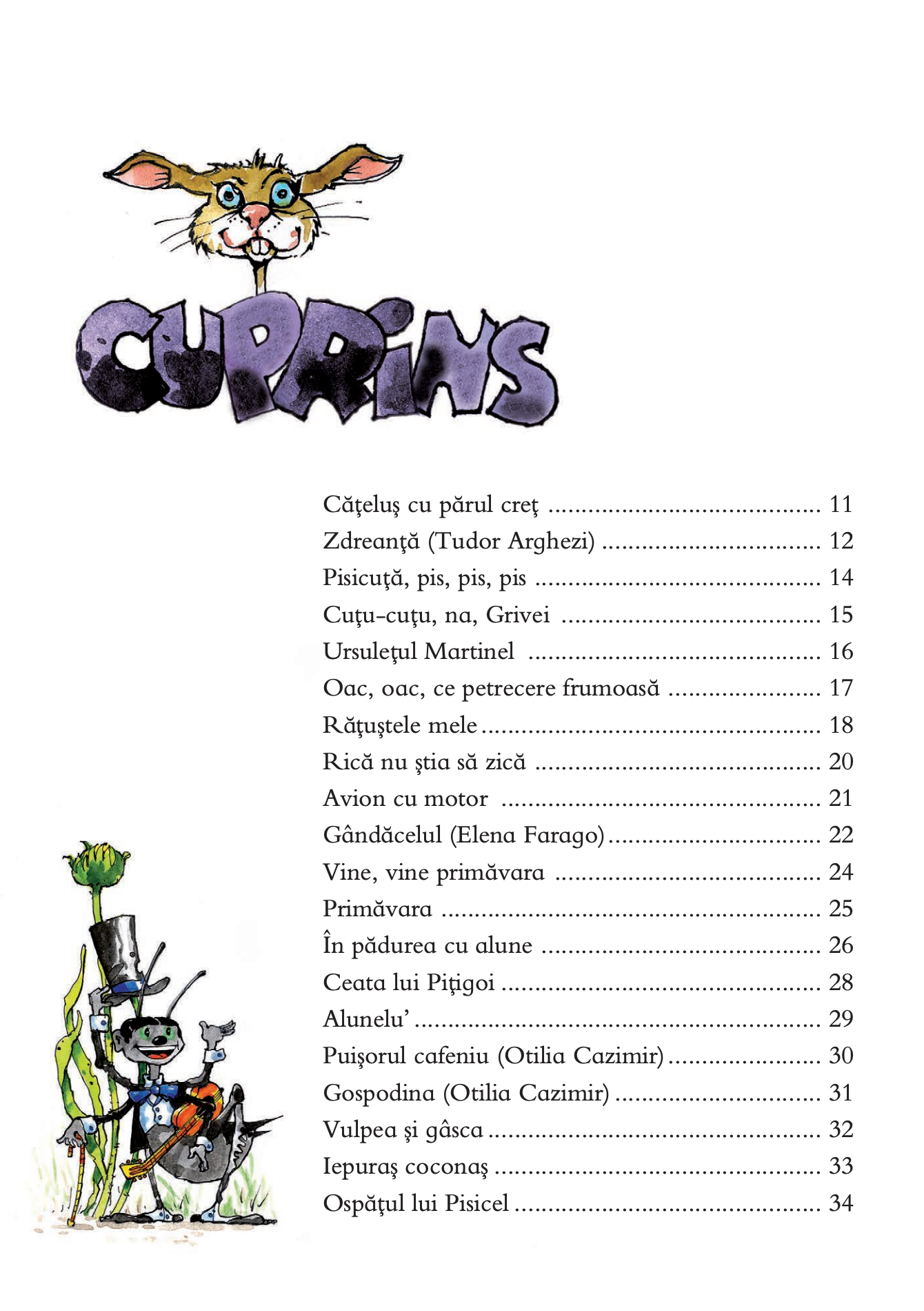• Căţeluş cu părul creţ • Zdreanţă (Tudor Arghezi) • Pisicuţă, pis, pis, pis • Cuţu-cuţu, na, Grivei • Oac, oac, ce petrecere frumoasă • Răţuştele mele • Rică nu ştia să zică • Avion cu motor • Gândăcelul (Elena Farago) • Vine, vine primăvara • Primăvara (Vasile Alecsandri) • În pădurea cu alune • Ceata lui Piţigoi • Alunelu • Puişorul cafeniu (Otilia Cazimir) • Gospodina (Otilia Cazimir) • Iepuraş coconaş • Înfloresc grădinile (Şt. O. Iosif) • Vine ploaia (George Coşbuc) • Căţeluşul şchiop (Elena Farago) • Un elefant se legăna • Melc, melc codobelc • Ţăranul e pe camp • Gărgăriţă, riţă • A zis mama că mi-o da …şi multe altele.