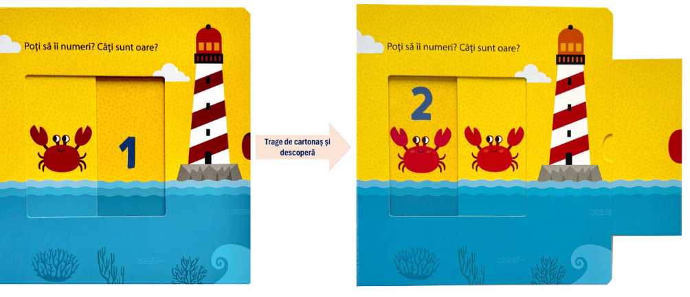 O carte-jucărie pentru primele lecții, cu glisoare ușor de mișcat, chiar și pentru mânuțe încă nesigure.
