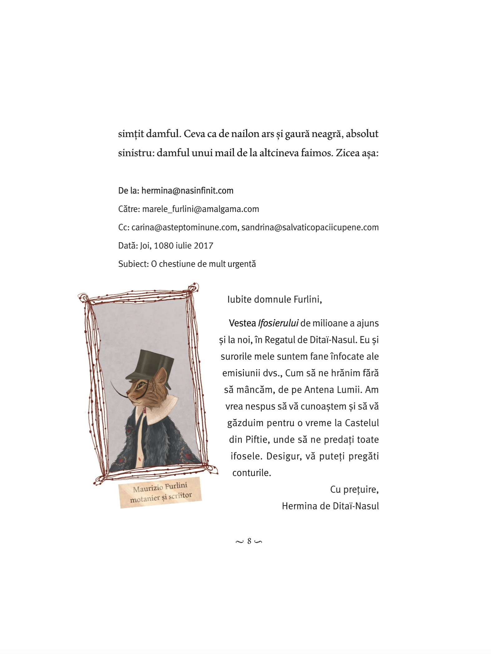 Vestea Ifosierului de milioane a ajuns și la noi, în Regatul de DitaïNasul. Eu și surorile mele suntem fane înfocate ale emisiunii dvs. (...) Am vrea nespus să vă cunoaștem și să vă găzduim pentru o vreme la Castelul din Piftie, unde să ne predați toate ifosele.