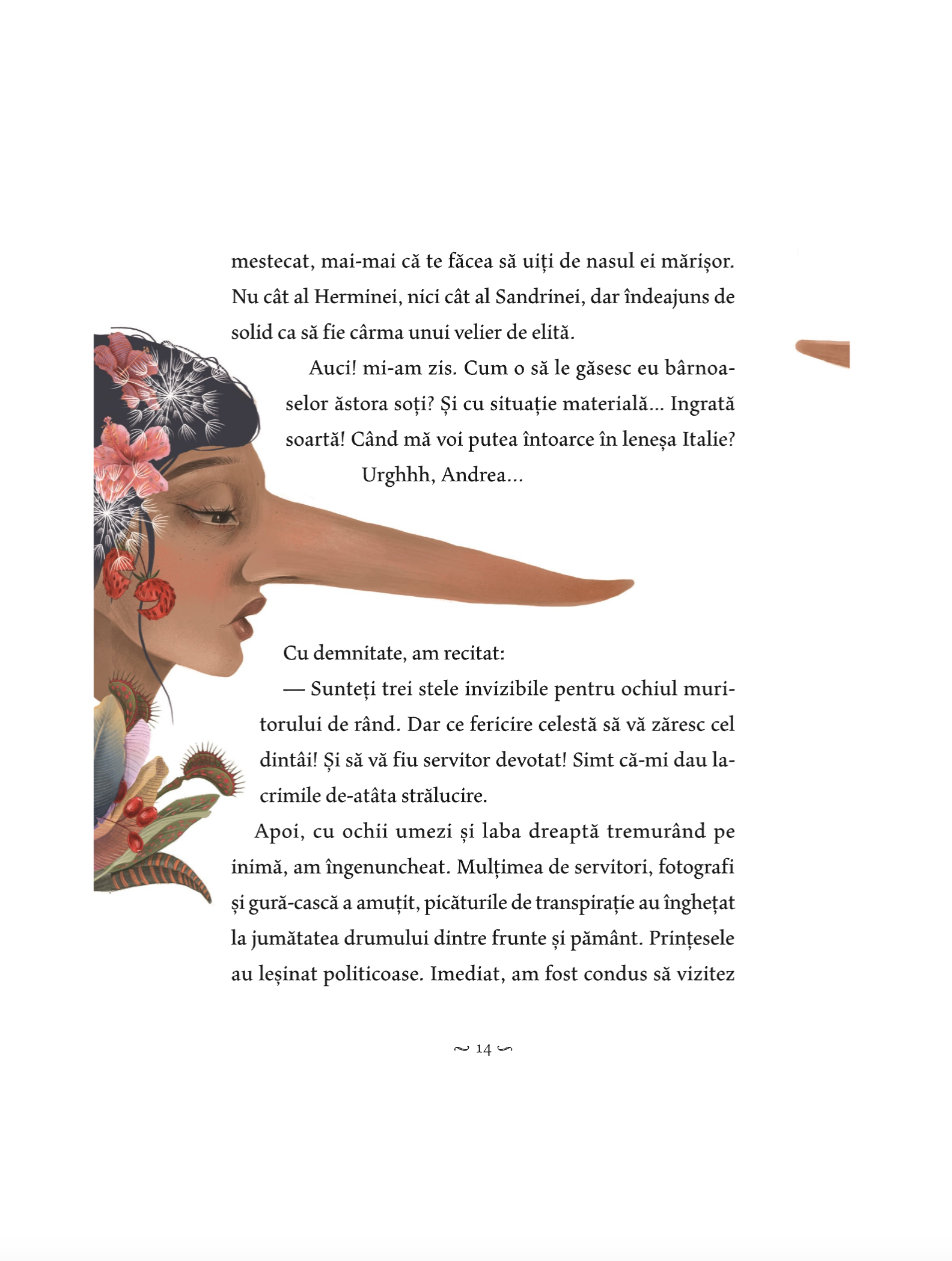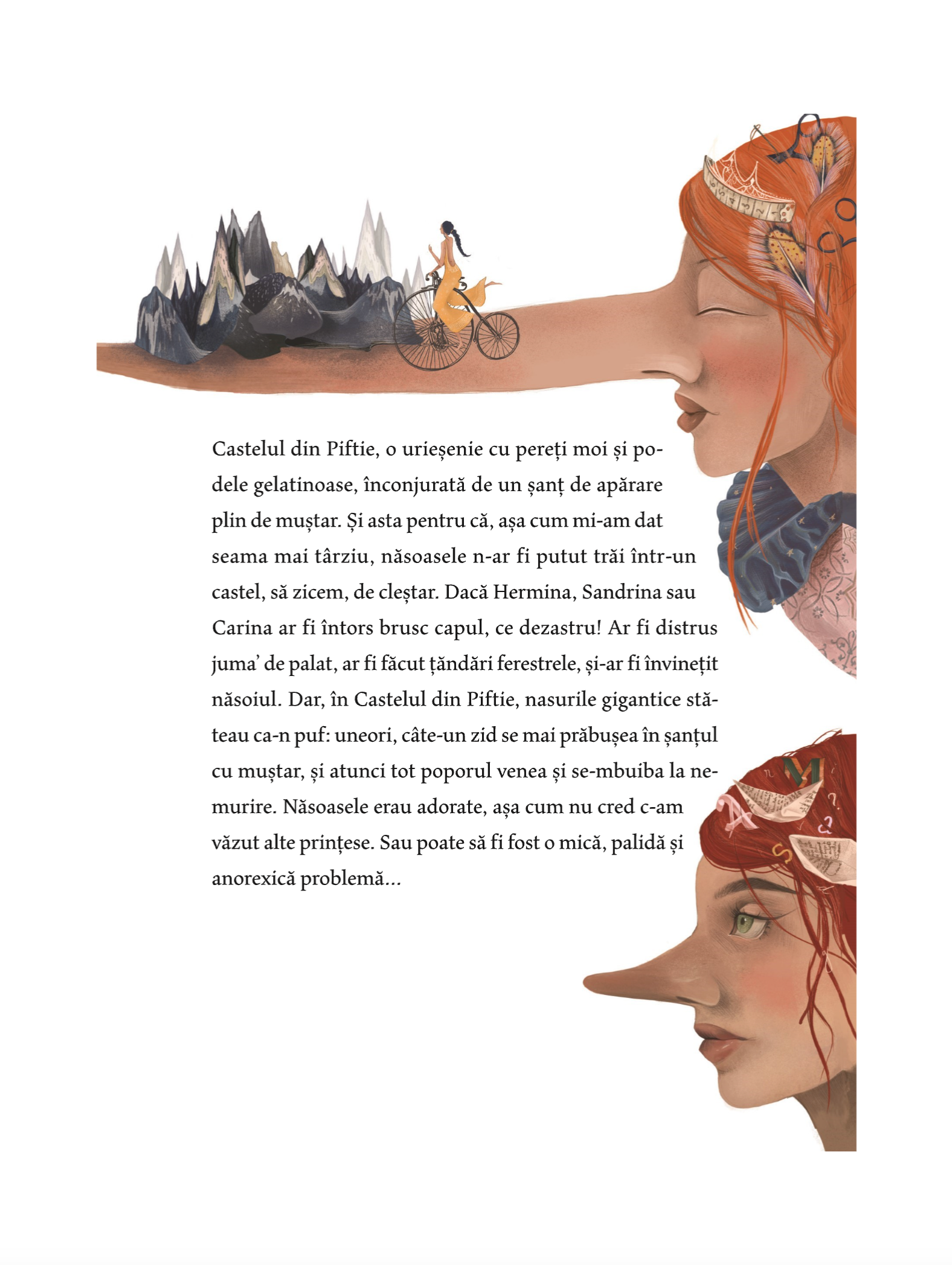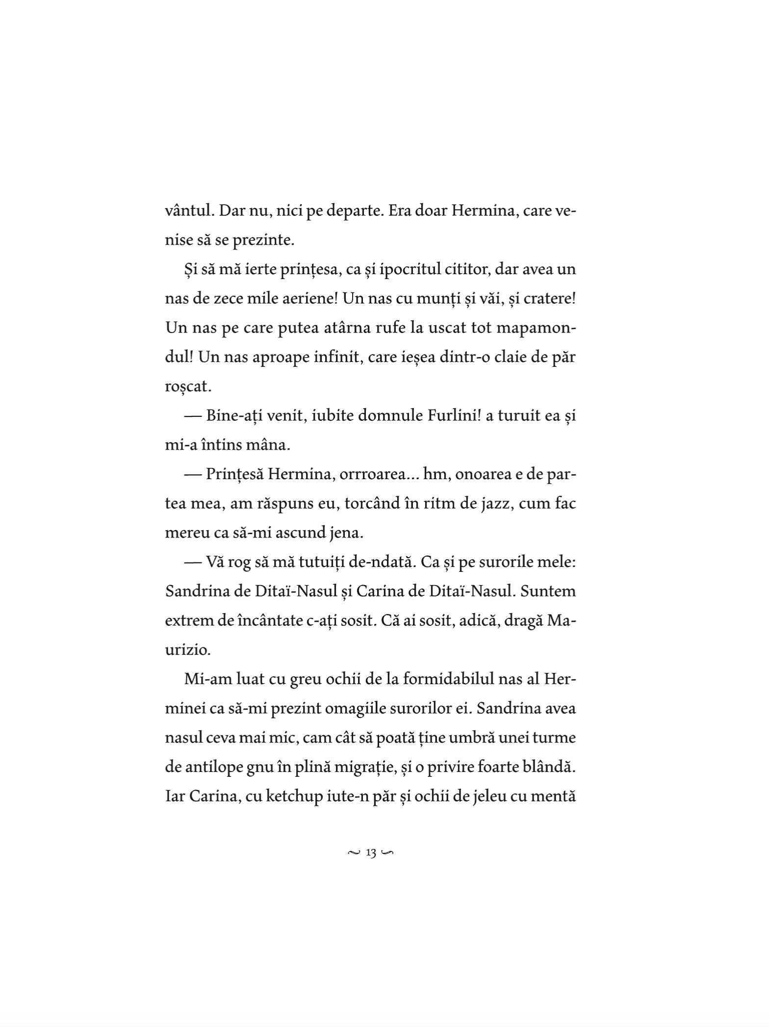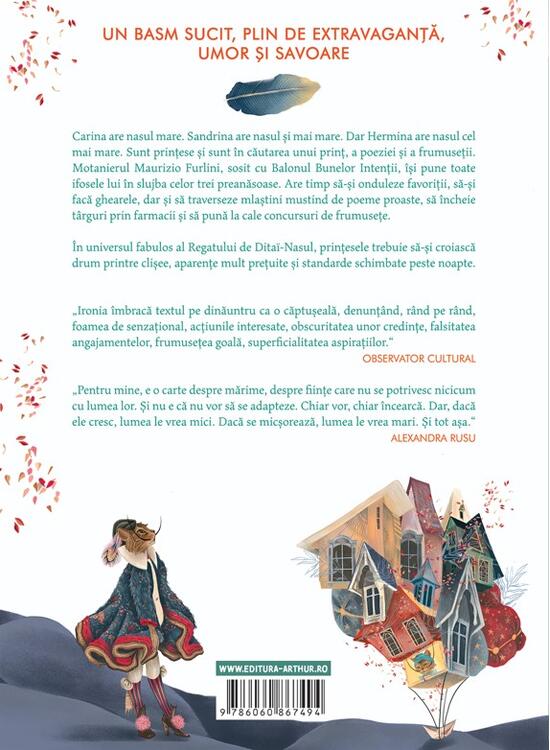 Carina are nasul mare. Sandrina are nasul și mai mare. Dar Hermina are nasul cel mai mare. Sunt prințese și sunt în căutarea unui prinț, a poeziei și a frumuseții. Motanierul Maurizio Furlini, sosit cu Balonul Bunelor Intenții, își pune toate ifosele lui în slujba celor trei preanăsoase. Are timp să-și onduleze favoriții, să-și facă ghearele, dar și să traverseze mlaștini mustind de poeme proaste, să încheie târguri prin farmacii și să pună la cale concursuri de frumusețe.