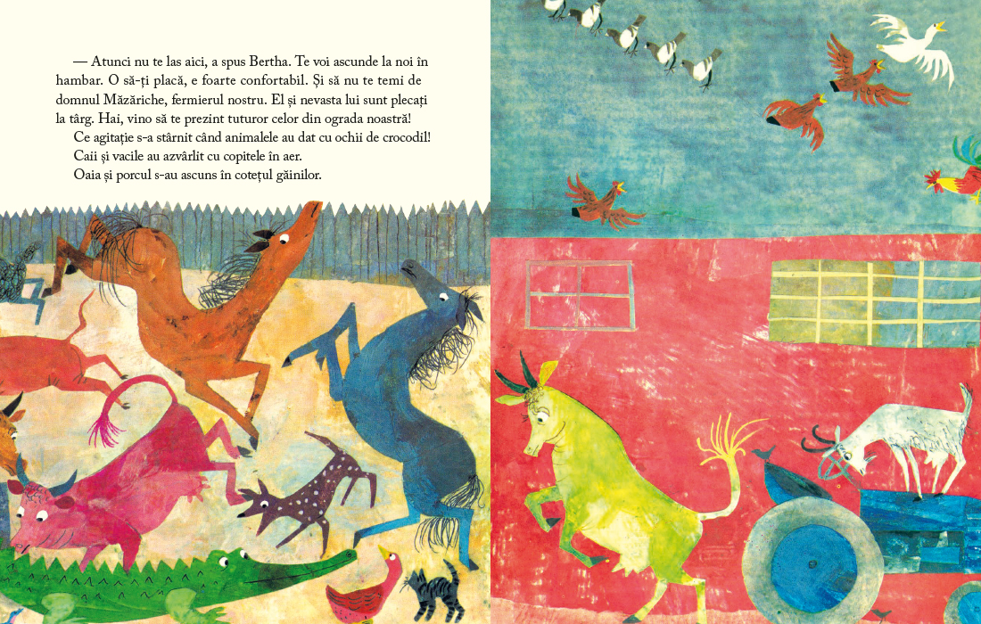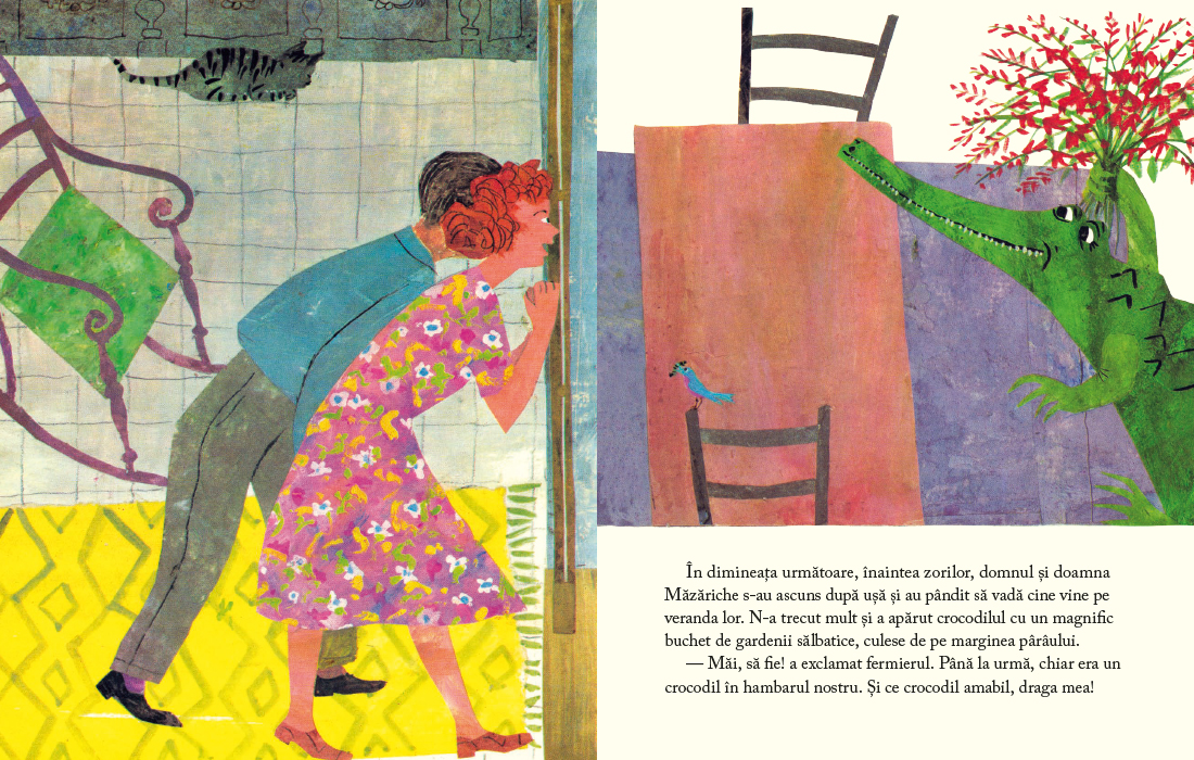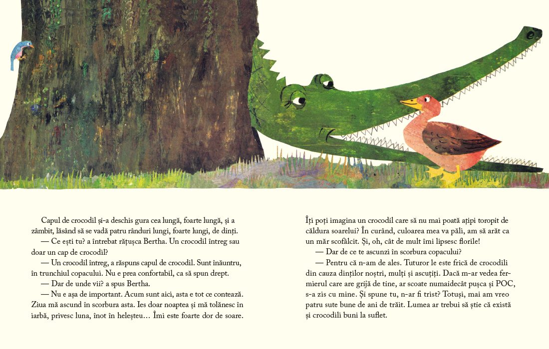 Povestea lui Roger Duvoisin are subtilitatea de a nu idealiza: nici în text, nici în ilustrații, dinții teribili ai crocodilului nu sunt ascunși. Cu alte cuvinte, e firesc să ne fie teamă de necunoscut, iar prejudecățile au uneori rostul lor, ne apără de pericole reale. Dar când încercăm să le depășim, avem șansa să ne facem prieteni buni, să cunoaștem diversitatea lumii și să ne găsim drumul în viață.