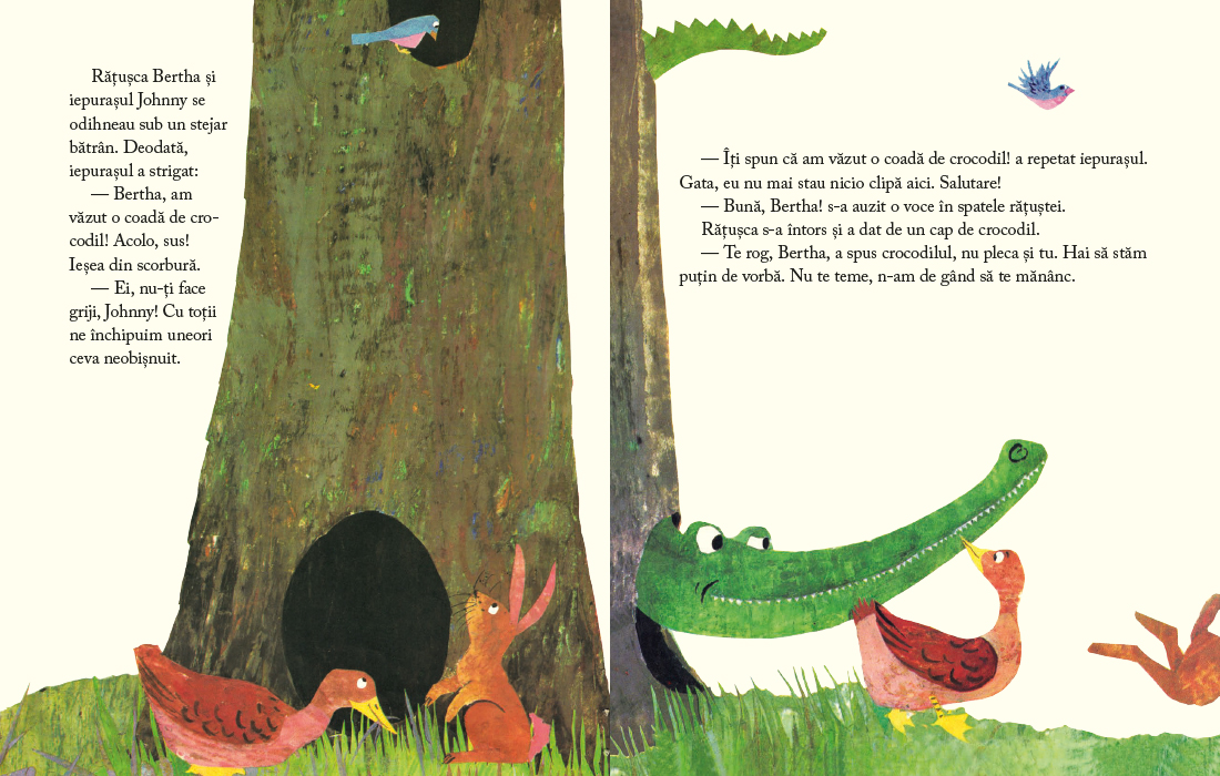 Crocodilii sunt mari, fioroși, au gheare și o mulțime de dinți ascuțiți. Nu vor decât să te înhațe, știe toată lumea. Cel puțin așa crede un iepuraș când descoperă un crocodil ascuns în scorbura unui copac. Iepurașul nu stă deloc pe gânduri, de crocodil fugi, e simplu. Poți să-l crezi când te roagă frumos să stai, să vorbiți de una-alta și poate chiar să fiți prieteni?