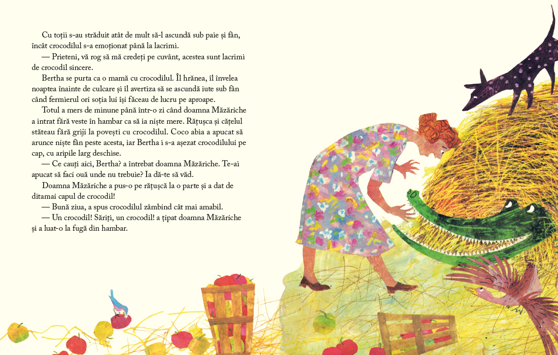 Dar o rățușcă oarecare are curajul să-și învingă teama și să stea de vorbă cu crocodilul. Dacă ești curios să cunoști pe cineva, cum s-o faci dacă fugi de el? Crocodilul se dovedește nu numai prietenos, ci și pasionat de flori și priceput la grădinărit, ceea ce-l face să-și găsească un rost printre locuitorii fermei unde trăiește rățușca.