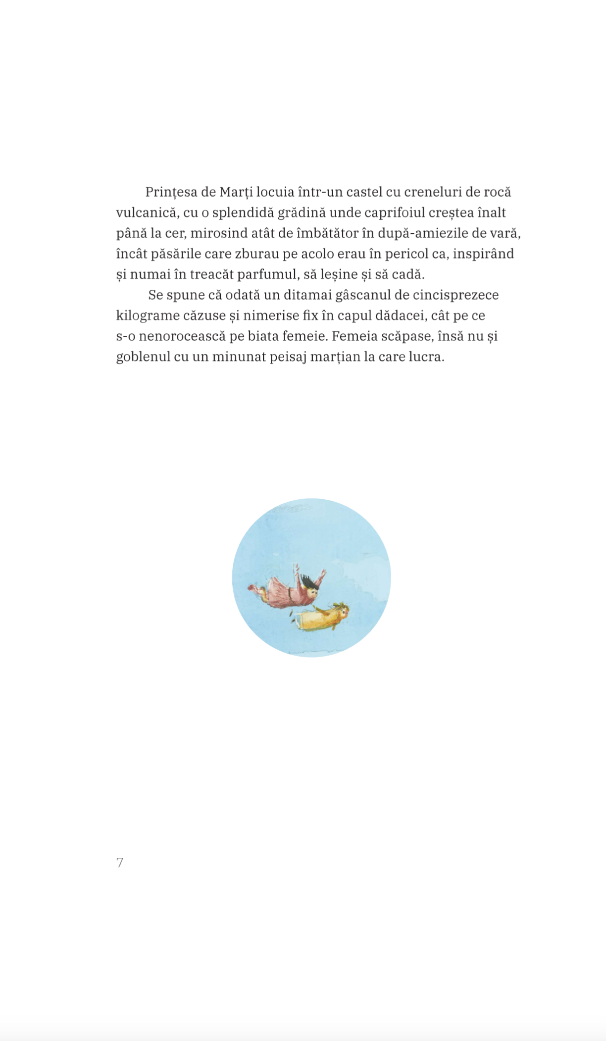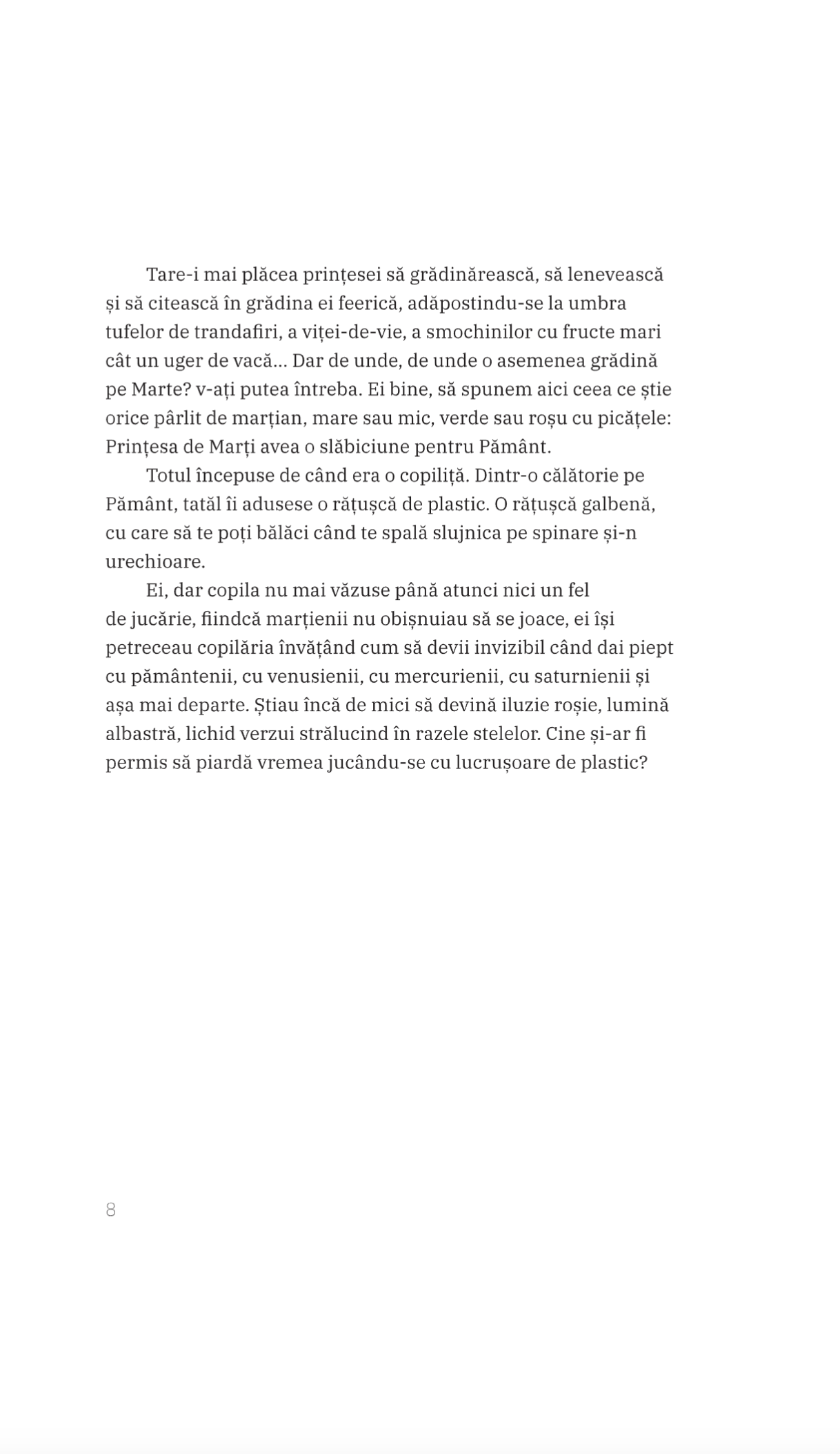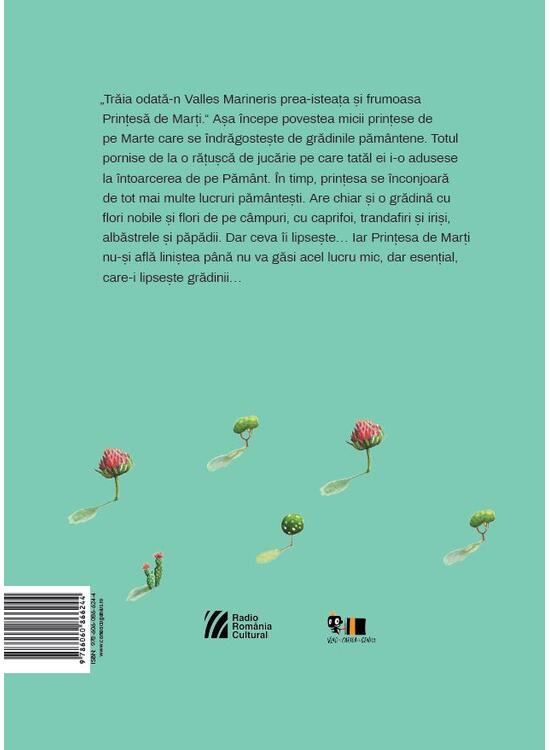 „Trăia odată-n Valles Marineris prea-isteața și frumoasa Prințesă de Marți." Așa începe povestea micii prințese de pe Marte care se îndrăgostește de grădinile pământene. Totul pornise de la o rățușcă de jucărie pe care tatăl ei i-o adusese la întoarcerea de pe Pământ. În timp, prințesa se înconjoară de tot mai multe lucruri pământeşti. Are chiar și o grădină cu flori nobile și flori de pe câmpuri, cu caprifoi, trandafiri și iriși, albăstrele și păpădii. Dar ceva îi lipsește... lar Prințesa de Marti nu-și află liniștea până nu va găsi acel lucru mic, dar esențial, care-i lipsește grădinii...