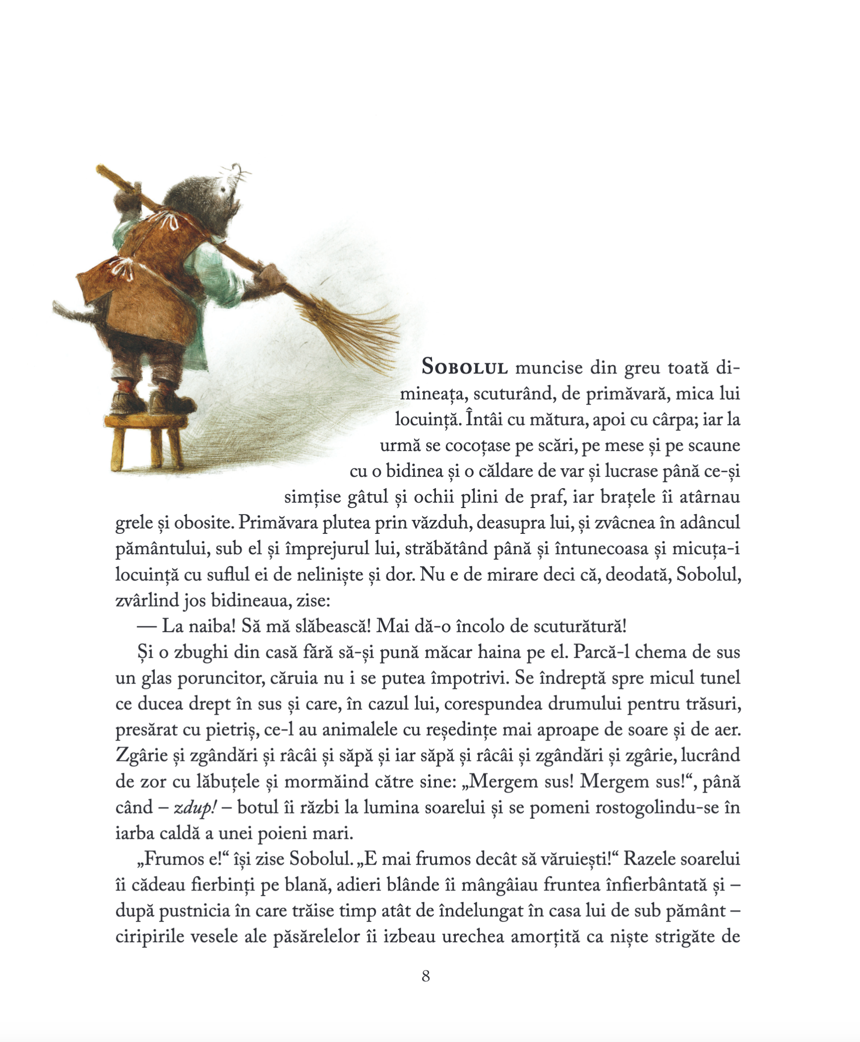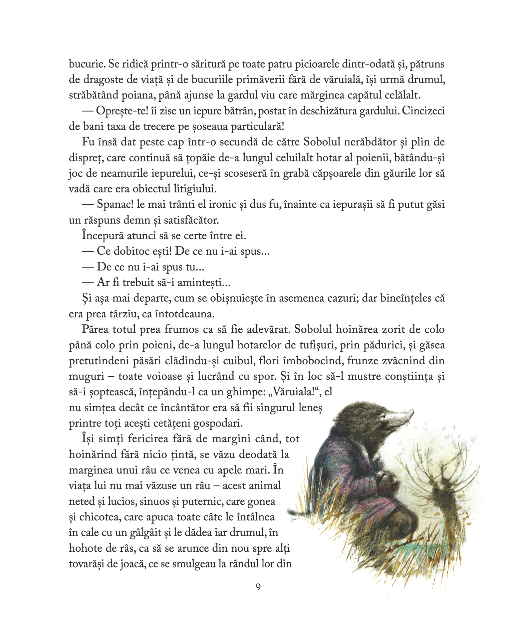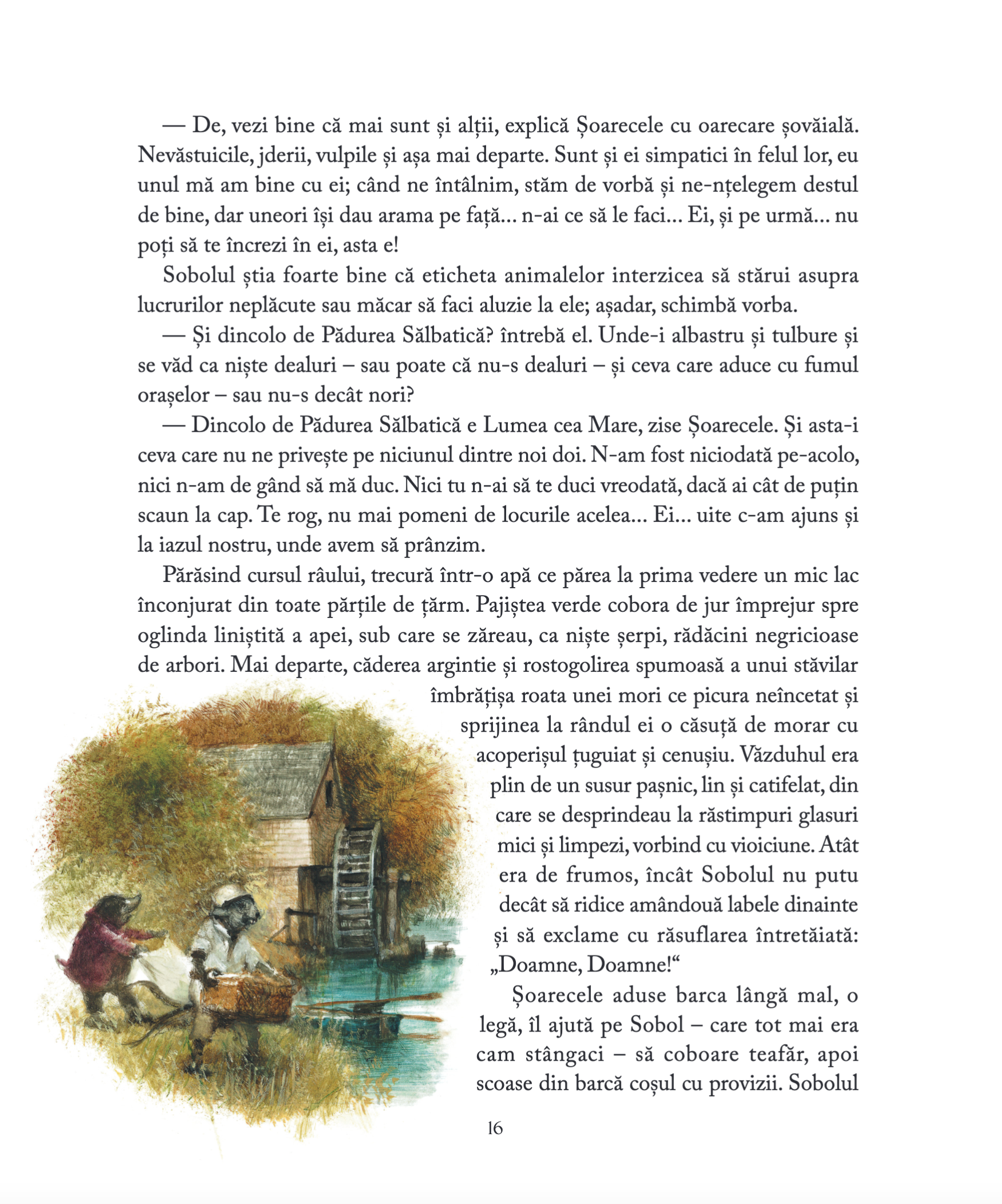 ̶ Iată! strigă Broscoiul, umflânduse de mândrie. Iată viața adevărată care vă așteaptă, întrupată în vagonul ăsta. Drumul mare, pulberea șoselei, ierburi, pășuni, tufișuri, văi, câmpii, sate, orașe, metropole! Azi aici, mâine cine știe unde! Călătorie, variație, aventură! Lumea întreagă înaintea ta și un orizont mereu în schimbare!