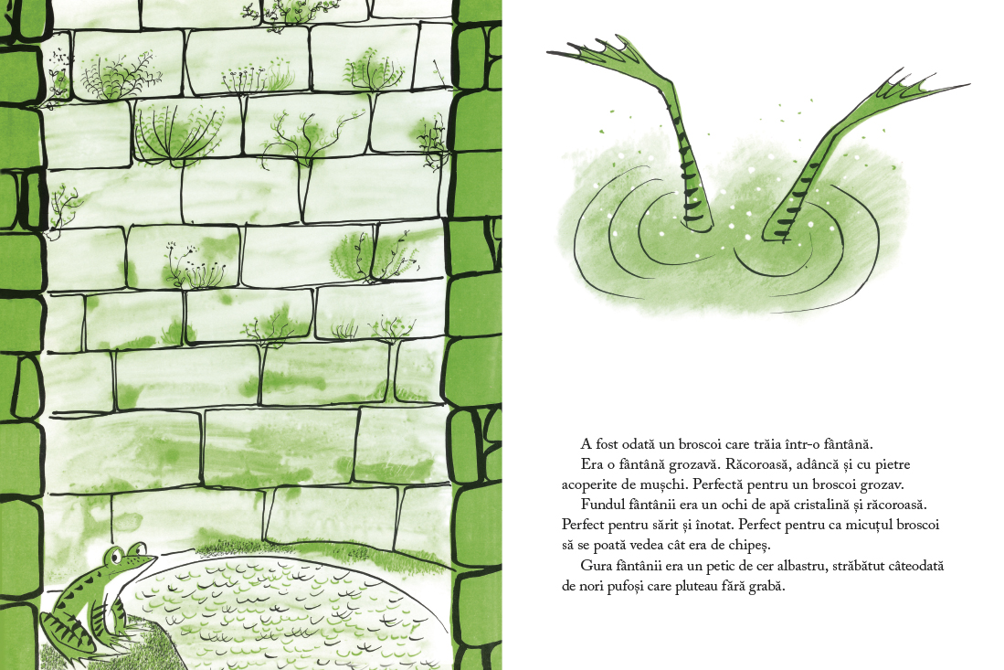 Micul broscoi trăiește de când se știe în adâncul unei fântâni și e fericit. Pietre de jur împrejur, acoperite de mușchi, un ochi de apă în mijloc în care poate să înoate în voie, un petic de cer și gâze care se aventurează nesăbuite în fântână și din care mănâncă pe săturate — asta e toată lumea, crede broscoiul.