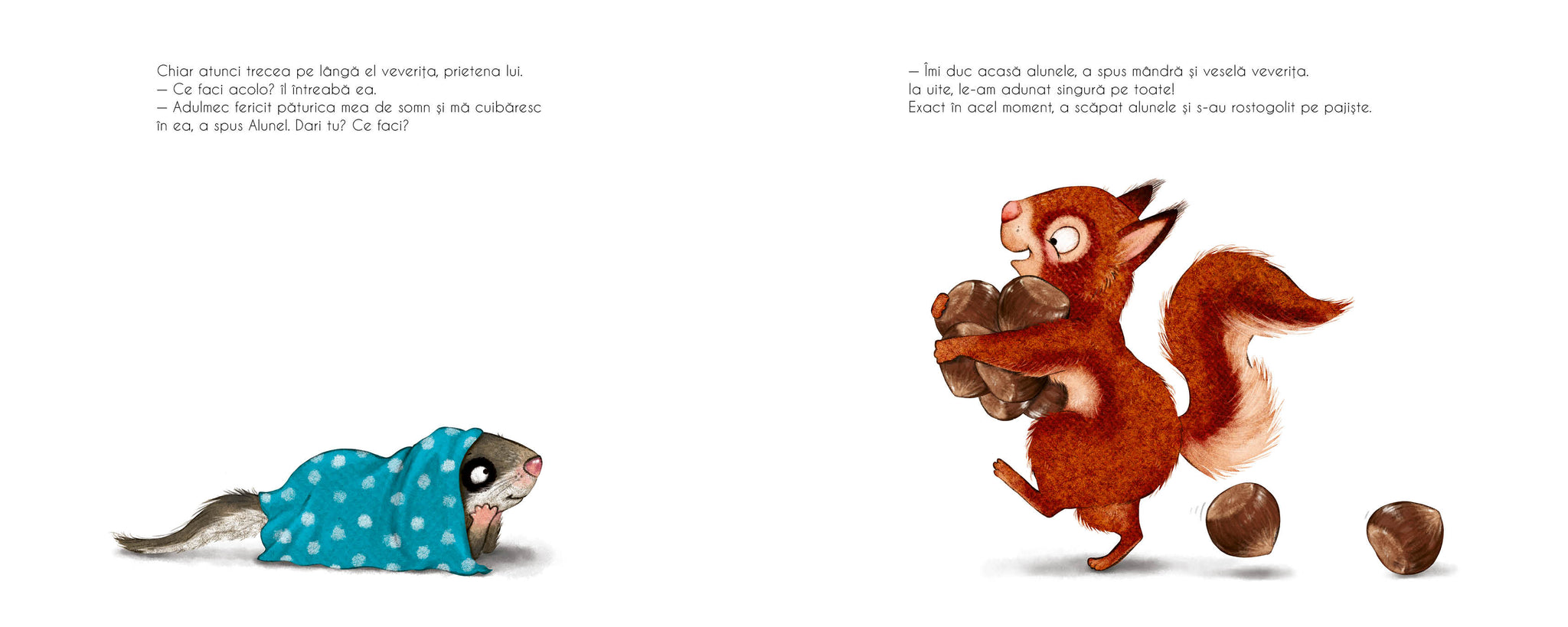 Micului alunar îi este tare dragă păturica de somn și nu vrea să o împartă cu nimeni. În mod exceptional, a împrumutat-o doar puțin prietenei lui, veverița, ca să-și care alunele cu ea. Apoi au avut nevoie de ajutor și șoricelul, și cârtița, precum și alte animale.
