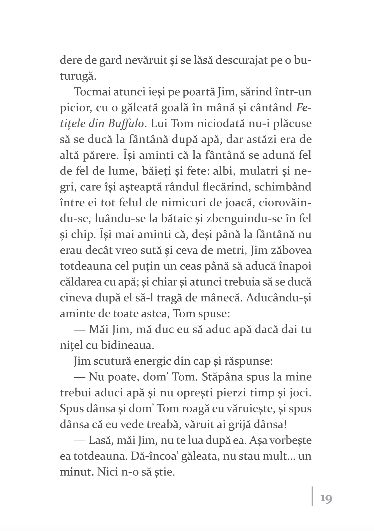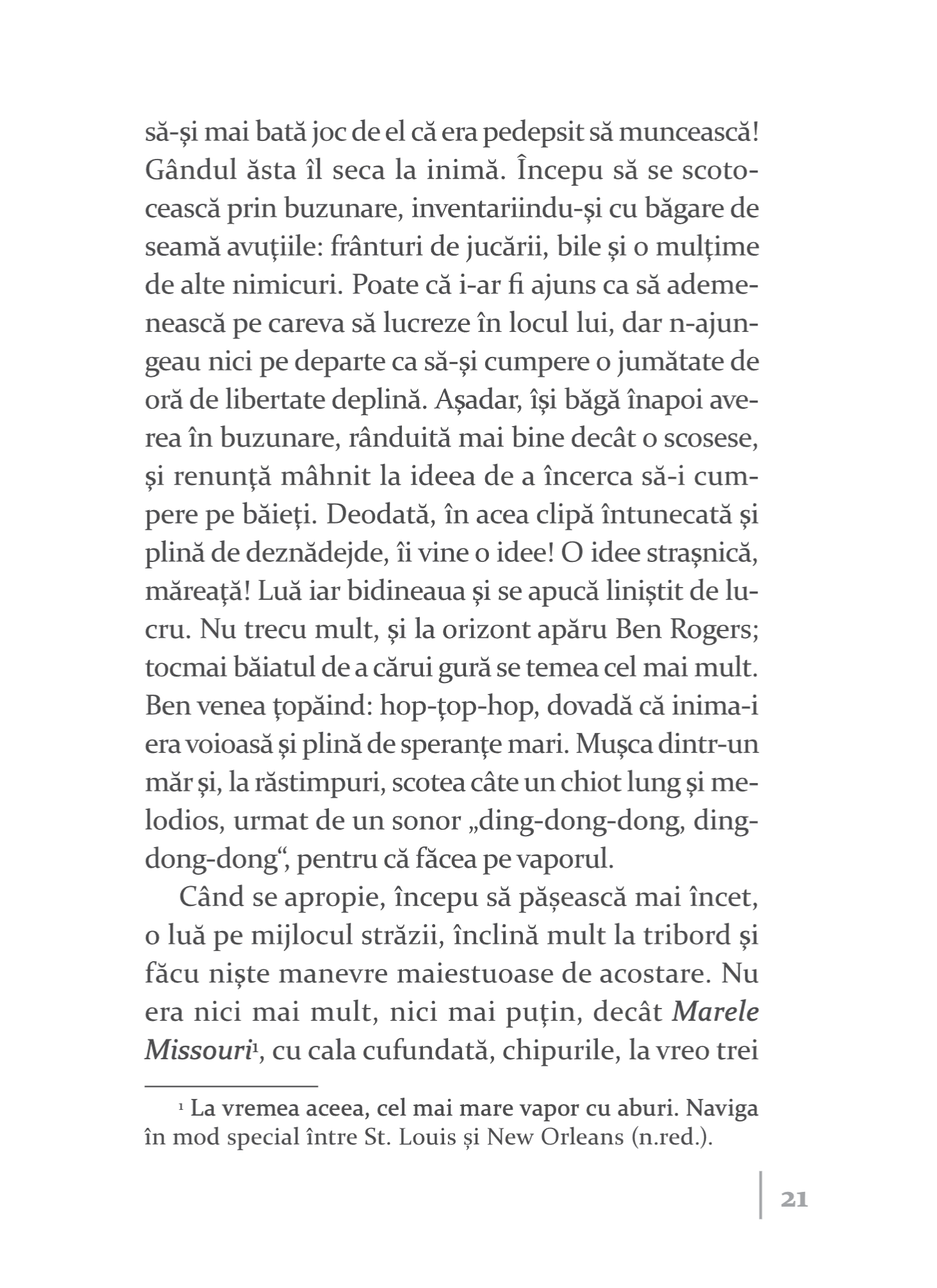 Pirat și haiduc, indiferent ce-ar face, Tom nu se plictisește în orășelul de pe Mississippi, iar prietenii lui, Huck și Joe, sunt mereu gata să-i fie alături în orice aventură.