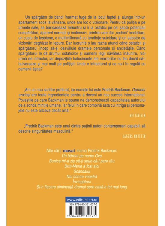 "Am un nou scriitor preferat, iar numele lui e Fredrik Backman. Oameni anxioși are toate ingredientele pentru a deveni un nou succes internațional. Poveștile pe care Backman le spune ne demonstrează capacitatea autorului de a sonda mințile umane, iar felul în care combină asta cu intriga și personajele nu este altceva decât artă." Nettavisen