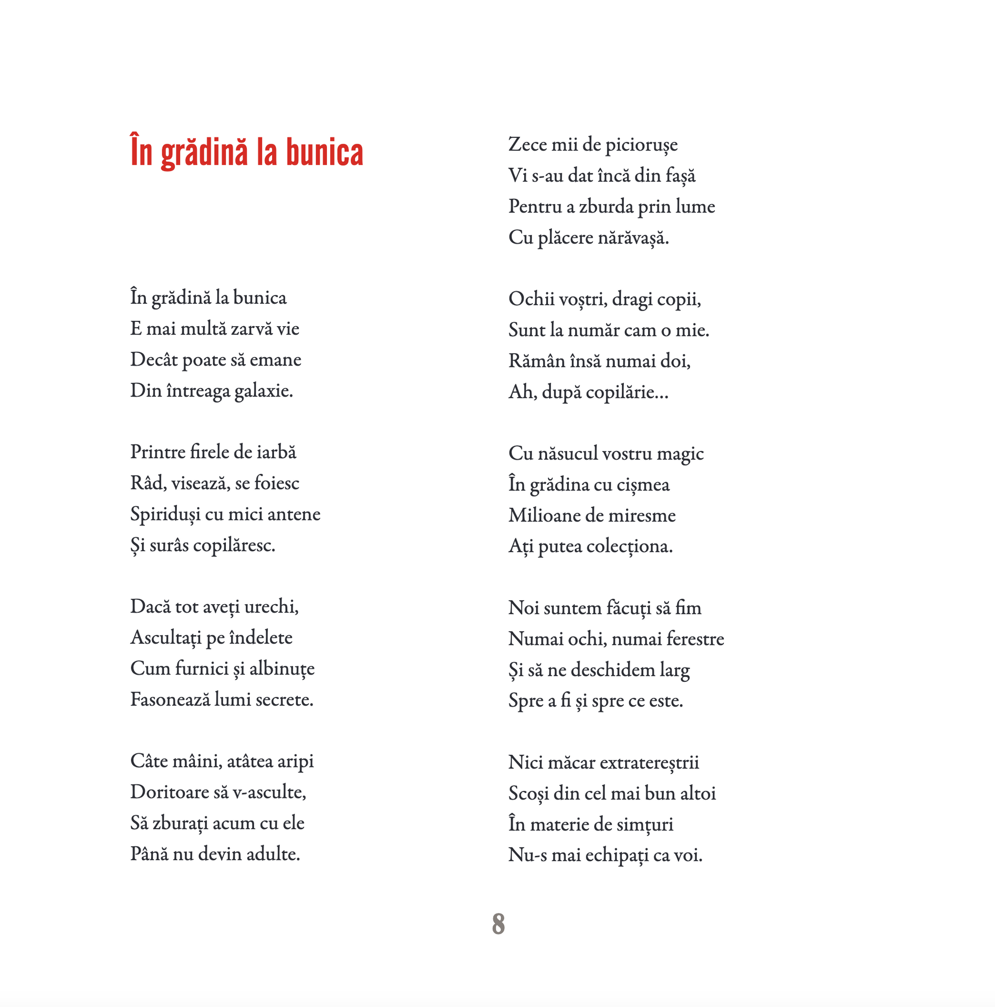De o profunzime aparte și cuceritor de simple, cu un firesc dezarmant, poeziile ce apar în piesele de teatru pentru copii ale lui Matei Vişniec pun în scenă marile teme dezbătute în fiecare volum în parte, într-un mod ludic care potențează gravitatea întrebărilor ce străbat toate vârstele vieții. Volumul de faţă pune laolaltă toate poeziile din piesele publicate de Matei Vişniec la Editura Arthur. Cu mult miez sub înveliș de umor, versurile traversează cu blândețe și înțelegere marea de sentimente, atitudini şi gesturi care ne fac oameni: dragostea şi resentimentul, bucuria şi remușcarea, visurile măreţe şi coşmarurile grele, sinceritatea şi prefăcătoria, prietenia şi răzbunarea.